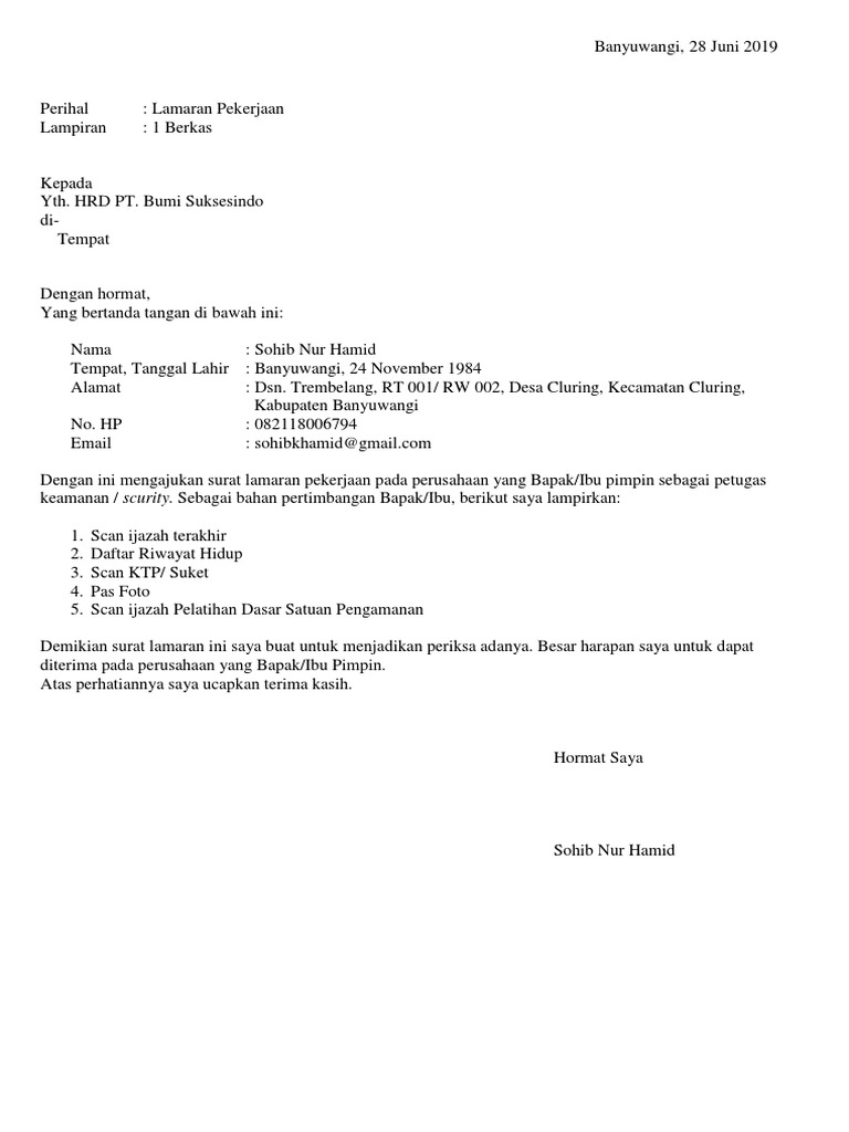 13 contoh surat lamaran kerja untuk security. Surat lamaran kerja memiliki format dasar yang hampir mirip dengan surat surat lainnya antara lain. Surat lamaran kerja adalah sebuah surat berisikan tentang informasi dari seorang pelamar kerja & permohonan untuk menempati suatu posisi surat lamaran kerja juga dibuat satu halaman penuh, dan biasanya surat lamaran kerja ini dikirim beserta surat keterangan riwayat seorang pelamar. Gunakan bahasa baku yang baik dan benar yang sesuai dengan ejaan yang disempurnakan (eyd) jika ada. Bila ingin mengetahui lebih jauh tentang surat lamaran kerja tulis tangan, kamu bisa melihat ketentuan beserta contoh pada uraian di bawah ini!